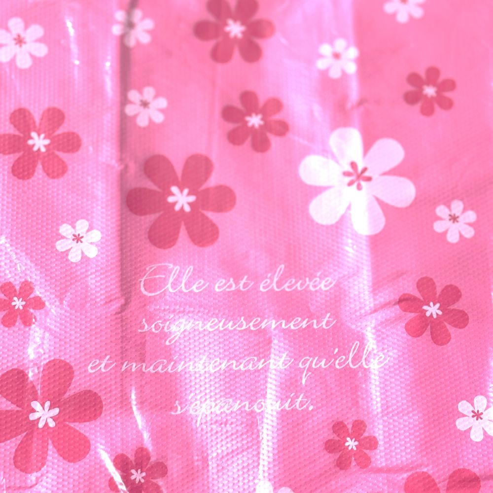 鮮やかなピンク色にお花をちりばめたポップなデザインのレジ袋です。